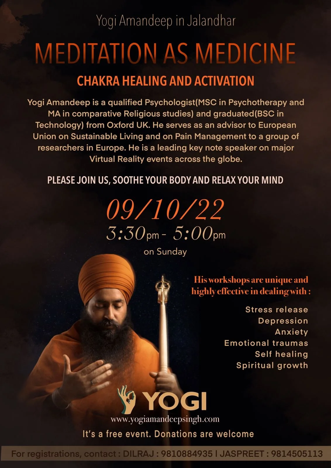 I am deeply touched by the meditative experience led by Yogi Amandeep Singh. Since then, I am in a mental state that is deeply stable, calm, centered and with a feeling of ecstasy! Guru ji I am longing for the next physical workshop in your presence